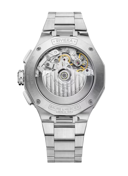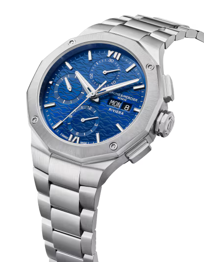 The Riviera chronograph 10826, inspired by the 43mm version, joins the collection in a slimmer 41mm format. Its dodecagonal case in polished and satin-finished stainless steel is protected by an anti-reflective sapphire crystal. The blue dial with a wave pattern, featuring snailed counters and snailed minute track, highlights the Roman numerals, indexes, and rhodium-plated hands with white Superluminova. It is equipped with an automatic movement with a 48-hour power reserve and water resistance to 10 ATM. The interchangeable stainless-steel bracelet features a reliable system for tool-free changes.
